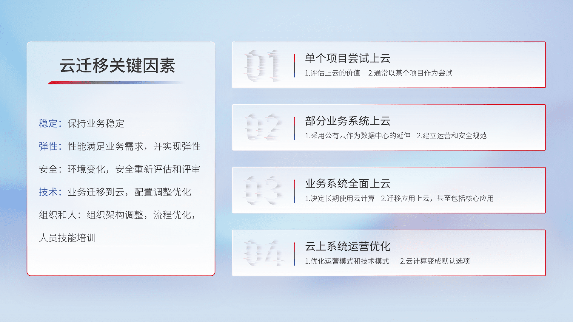 结合实际业务,,从规划设计、、、、云平台选型、、、云原生改造、、、数据迁移、、、、集成交付,,迁移全过程为客户识别最佳上云路径,,,,做好风险识别管理,,,设计网络架构、、、、身份权限、、安全审计合规、、、操作审计、、、日志审计、、监控告警策略、、、多站点容灾设计等,,对云上基础设施进行整体规划,,提升IT治理水平,,以满足弹性、、、、高可用、、、、高性能的需求。。。。