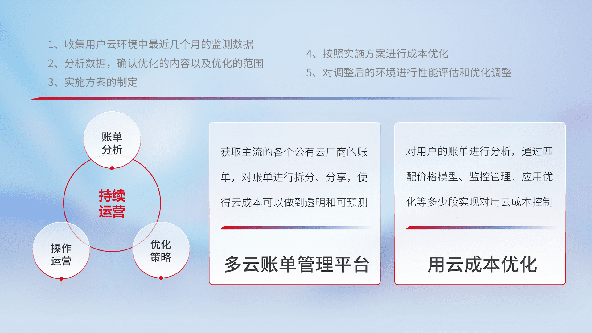 通过多云纳管,,,以统一的资源数据模型把客户的云资源进行抽象和封装,,进而实现对多云资源的统一操作,,,保障云资源管理的可靠性、、、、稳定性与可用性。。量身定制化运维内容,,,配置、、、开发运维、、、、补丁管理、、、、备份、、、、监控、、、、认证和访问管理、、审计和日常巡检等,,,保障在用云过程中的可靠度,,,稳定度以及高可用率。。。