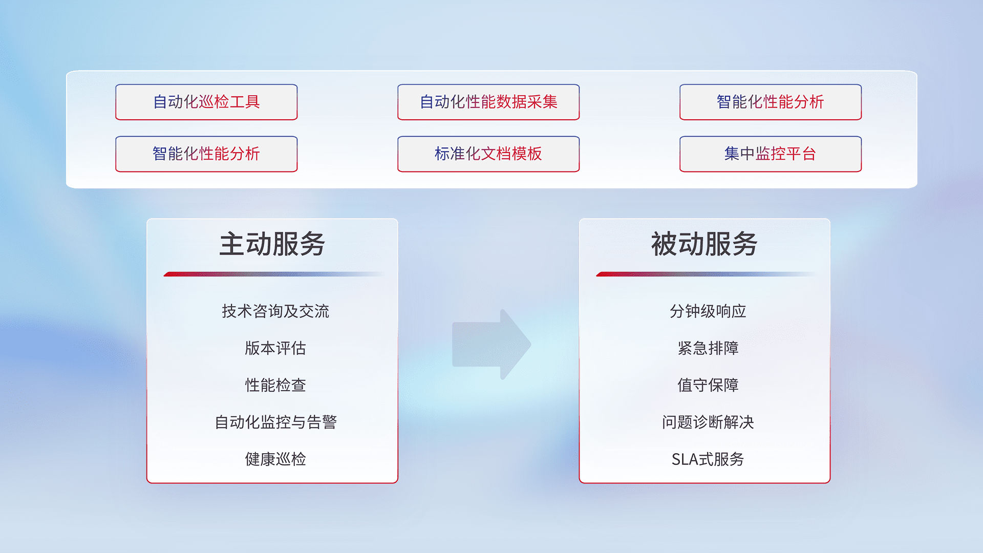 智能化工具和标准化文档,,保障服务质量,,,提供主动服务(包含技术咨询、、版本评估、、性能检查、、、、自动化监控与告警、、健康巡检)和被动服务包含(分钟级响应、、、紧急排障、、值守保障、、、问题诊断解决、、、、SLA服务)。。