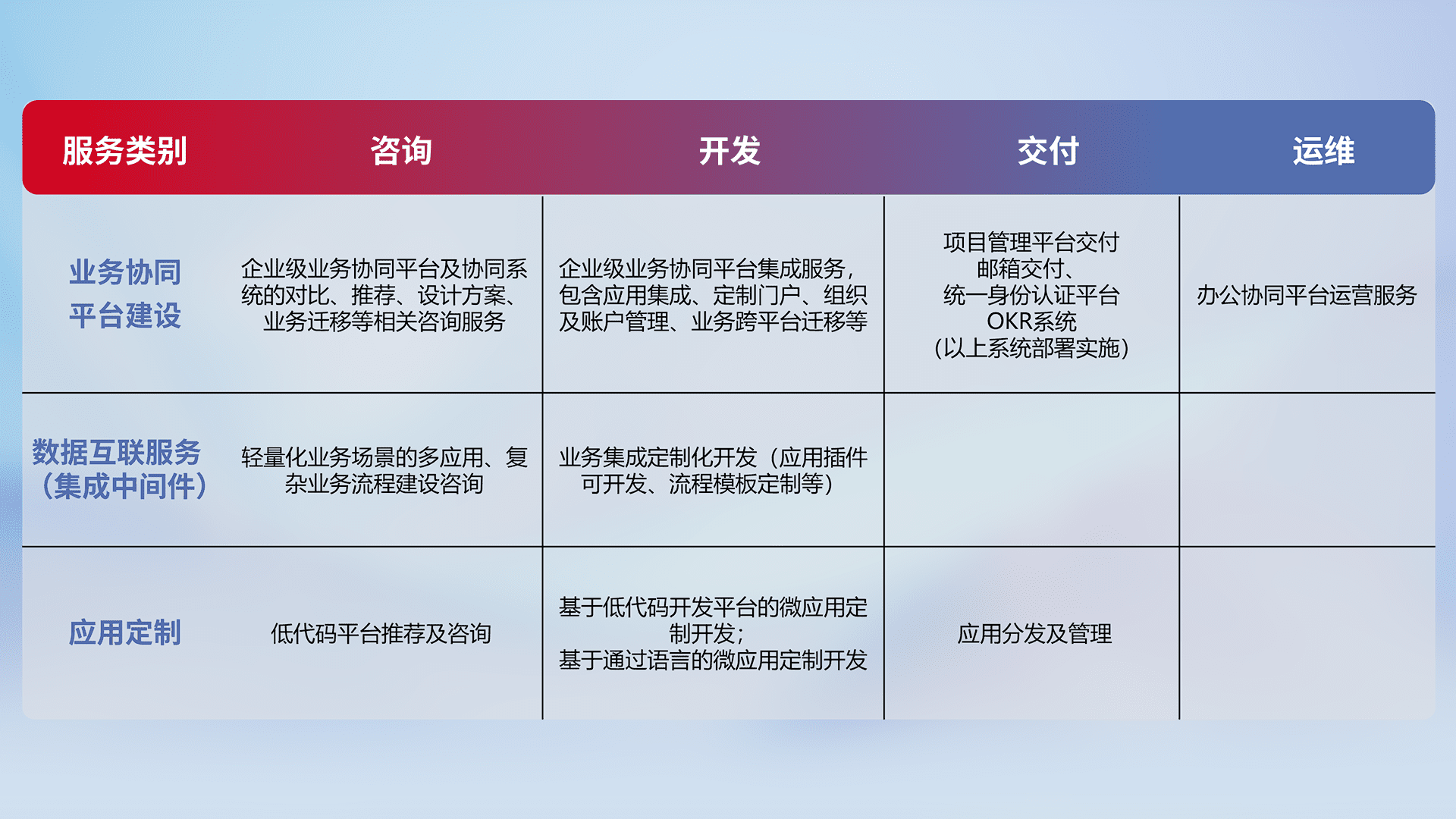 针对钉钉、、、、企微、、IDaas等平台级产品提供产品的规划、、、、方案、、、交付、、、定制化开发等服务,,,,实现如统一协同办公、、、、智能客户服务、、混合会议管理、、、智能数据查询、、、等业务场景,,,,实现数字化转型。。